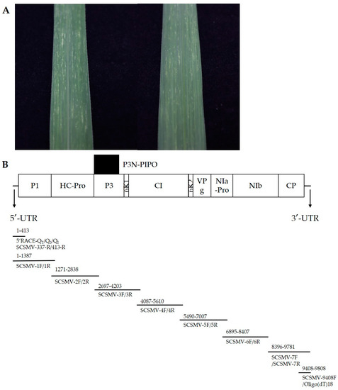Sugarcane (race ROC22) leaves showing the typical sugarcane mosaic symptoms were collected in the Yunnan province of China (Figure 1A).