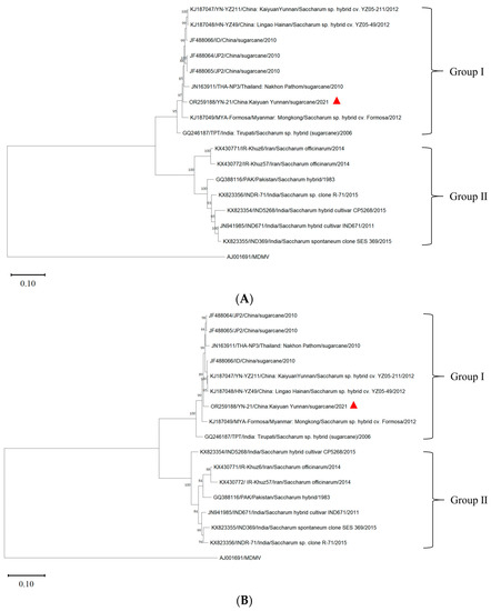 - Xu, D.L.; Park, J.W.; Mirkov, T.E.; Zhou, G.H. Viruses Causing Mosaic Disease in Sugarcane and Their Genetic Diversity in Southern China. Arch. Virol. 2008, 153, 1031–1039. [Google Scholar] [CrossRef] [PubMed]