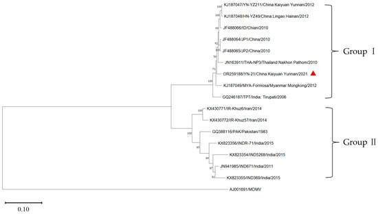Using the MDMV (AJ001961) genome as the outgroup, the phylogenetic tree of the complete genome of YN-21 and 15 other isolates was constructed by the maximum likelihood method using the software MEGA v11.0 (Figure 4). The sixteen SCSMV isolates were clustered into two groups (group I and group II). Group I included YN-21 and eight isolates from Yunnan (YN-21211, ID, JP1, JP2) and Hainan (HN-YZ49) in China, Thailand (THA-NP3), Myanmar (MYA-Formasa), and India (TPT). Group II included seven isolates from Iran (IR-Khuz57, IR-Khuz6), Pakistan (PAK), and India (IND5268, INDR-71, IND369, IND671). The results indicated that the YN-21 isolate was closely related to the SCSMV isolates from the Yunnan and Hainan provinces in China. We found that the grouping of the phylogenetic tree without recombinant genes is consistent with that of the full genome, but there are small differences between the second partition and the full genome.