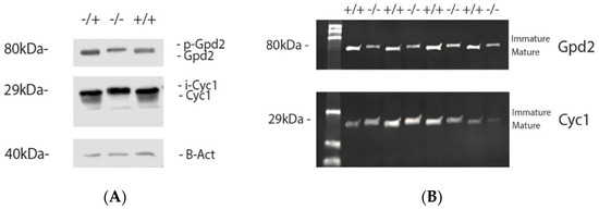 Gpd2 functions as an integral component of the Glycerol Phosphate Shuttle (GPS) with its interactive cooperation between two closely related component molecules Gpd1 (cytosolic component) and its isozyme Gpd2 (mitochondrial component) with FAD as a cofactor. The GPS reduces quinone to quinol, recycles NADH to NAD+ for glycolysis and provides a supply of electrons for the electron transport chain through the production of FADH2 from the cyclical conversion of dihydroxyacetone phosphate (DHAP) (derived from glycolysis) to glycerol 3-phosphate (G3P) and back to DHAP. Gpd2 is a nuclear-encoded mitochondrial protein synthesized within the cytosolic ribosome as a precursor protein (p-Gpd2 ~81kDa) with a mitochondrial signal peptide sequence [3,63,85]. p-Gpd2 is translocated to the IMM where its signal peptide is cleaved-off in a single step proteolysis by Immp2l to yield the mature form of Gpd2 (m-Gpd2 ~76kDa). In our western analysis of proteins from brain and kidney, and from mitochondria purified from these tissues, we observed the accumulation of only the immature precursor form of Gpd2 (p-Gpd2 ~81kDa) in Immp2lKD −/− KO mice but not in their heterozygous or wild-type littermates (Figure 1A,B) that had only the fully processed (mature) form of Gpd2 (mGpd2 ~76kDa) in their mitochondria (Figure 1A,B). Consistent with our findings for Cyc1, these results confirmed that Immp2lKD −/− KO mice were devoid of Immp2l peptidase activity thus confirming their status as full Immp2l knockout (KO) mice and that any associated phenotypes are Immp2l KO phenotypes. No change in the size of Aifm was detected in the brain of either wild-type or Immp2lKD −/− KO mice.