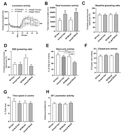 A most interesting feature related to the many previous investigations of the earlier truncated Immp2lTg(Tyr)979Ove mouse model was that a number of its oxidative stress phenotypes were successfully reversed by administration of a synthetic mitochondrial targeted antioxidant named SkQ1 provided in drinking water [28,29]. To explore if oxidative stress is associated with the behavioural changes in our new Immp2lKD −/− KO mouse, we likewise administered a mitochondrial targeted antioxidant Mitoquinone (MitoQ) in the drinking water of mice from the time of weaning. MitoQ is a synthetically modified form of coenzyme Q10 bound with triphenylphosphonium-based cations that target MitoQ to the mitochondria making it more potent in lessening mitochondrial-derived oxidative damage than untargeted antioxidants. The SkQ1 used by Lu et al. [28,29] and the MitoQ used in this study show comparable efficacy in lowering oxidative stress when administered in drinking water [30,31]. Moreover, MitoQ is proven to be effective at lowering oxidative stress in mice [32,33,34] and in humans [30].