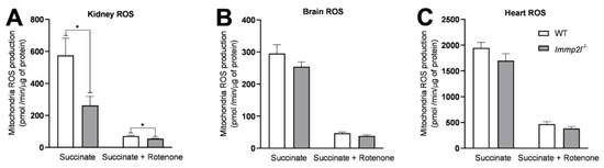 Immp2lKD −/− KO mice show decreased ROS levels compared to wild-type littermates. (A–C) Quantification of reactive oxygen species (ROS) generation in mitochondria isolated from kidney, brain and heart (n = 10–18/group) * p < 0.05. Error bars represent SEM.