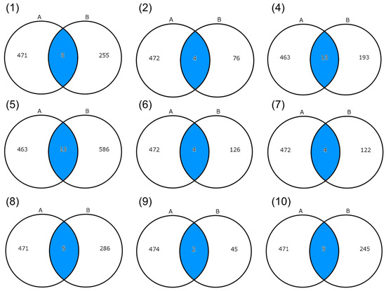 Overlap between genes that contained filtered variants identified in affected individual(s) in each family that overlapped with genes that were highly expressed in temporal vs. Achilles tendons of pigs. A, numbers of differentially expressed genes in temporal vs. Achilles tendons of pigs by RNA-seq; B, numbers of genes with filtered variants that were identified in each family by WGS; (1)–(10), Family01–10, respectively; except Family03 for whom no overlapping genes were identified. Blue indicates numbers of overlapping genes.