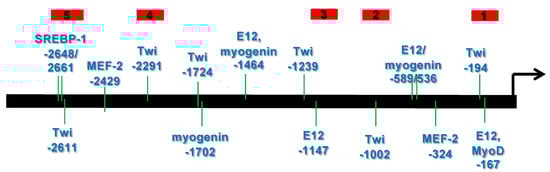 To determine if there were any possible TWIST2 binding sites in the CHRDL1 gene 5′ flanking region, we performed bioinformatic analysis of the upstream sequences of the human CHRDL1 gene. For this analysis, we employed the TESS tool available at the University of Pennsylvania website. TESS analysis rendered a list of putative binding sites of different transcription factors. We focused on those elements that we considered biologically relevant to the role of TWIST2 (Figure 1). The TESS analysis identified putative binding sites, at positions relative to the transcription start site, for E12/E47 (−1464, −589, −536, −167), MyoD (−167), myogenin (−1702, −589, −536), SREBP1 (−2661, 2648), MEF-2 (−2429, −1972, −324) and TWIST (−2611, −2241, −1239, −1002, −194). The TWIST element consensus sequence used by TESS is for the Drosophila TWIST protein, which Li et al. [] showed that TWIST2 can bind oligonucleotides harboring this element. TESS analysis did not identify a putative TATA binding protein (TBP) site/TFIID site at the expected location.