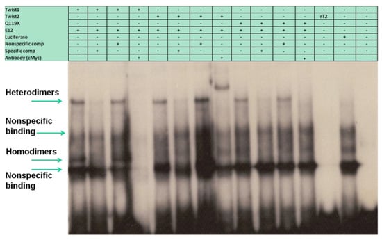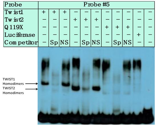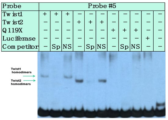 We evaluated the possibility of heterodimeric binding of TWIST1 and TWIST2 with E12 by including both expression constructs in the in vitro TNT reactions. We found that from the five probes (Figure 1) only probe #5 was bound by heterodimers of TWIST1, TWIST2, and Q119X with E12 (Figure 7). The binding of these heterodimers was confirmed by specific competitions using the CH22700EA double-stranded oligo and the SP1 oligo as a non-specific competitor. This finding indicates that the TWIST2 Q119X mutant protein can bind the probe #5 DNA, but only as a heterodimer with E12. The supershift reaction for the TWIST2 Q119X/E12 heterodimer inhibited the DNA–protein complex formation, as had been seen before in EMSAs using an oligonucleotide derived from an E-box located in a conserved region of the human TNFα gene promoter []. Even though the TWIST2 Q119X mutant protein can bind as a heterodimer, it may fail to recruit the cofactors necessary for repression of CHRDL1 gene expression [].