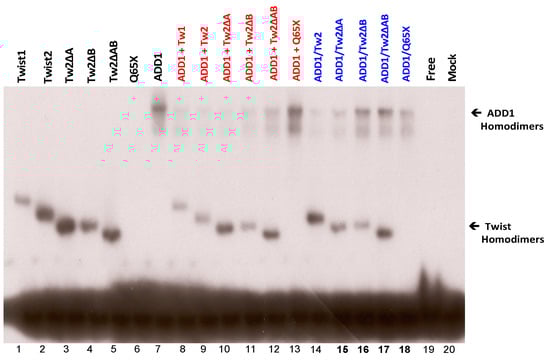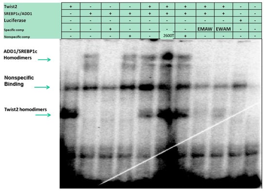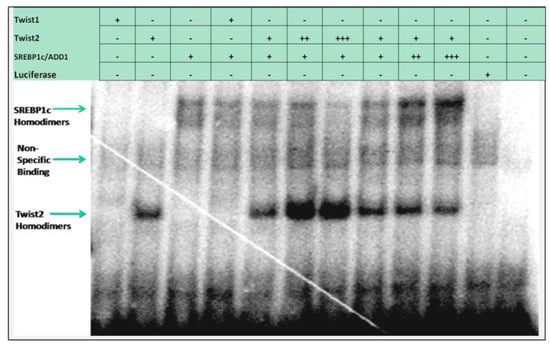 Also, it can be noted that the amounts of TWIST2ΔA protein bound to DNA when co-expressed with SREBP1c versus the amount bound in the homodimers reaction is reduced. This could be because there is more of TWIST2ΔA interacting with SREBP1c, and this TWIST2ΔA/SREBP1c complex cannot bind DNA, but its formation reduces the amount of TWIST2ΔA homodimers available for binding the probe. On the other hand, the reduced intensity of the TWIST2ΔB band, both in the homodimeric reactions and when co-expressed with SREBP1c, could be because this particular mutant has lower binding affinity towards the DNA than the TWIST2ΔA or Twist2ΔAB mutants.