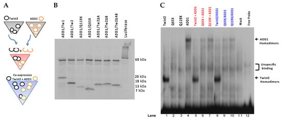 To determine whether TWIST2 uses its N-terminus to interact with SREBP1c and reduce its ability to bind to DNA, we conducted EMSA assays with C-terminus-Myc/His-tagged SREBP1c and/or N-terminus-Myc-tagged TWIST2 or N-terminal-Myc-tagged TWIST2 mutant proteins (Figure 8). To favor homodimer formation (Figure 8A), each protein was individually produced by in vitro transcription and translation (TnT) (black colored test tubes). The red color test tube represents test tubes used for the binding reaction between homodimers used for EMSA in which 1 µL of each protein that was individually synthesized was mixed for a total of 2 µL (lanes 5–7 in Figure 8C). Since each protein is presumably present as homodimers, it decreases the chances of interacting with the other protein to form a heterodimer; however, we cannot rule out heterodimer formation when these reactions are mixed. However, homodimers can also be present in these mixed reactions.