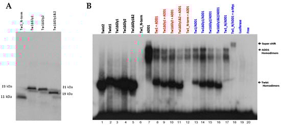 Production of TWIST1 and deletion mutant TWIST1 proteins using TnT reactions and assessment of DNA binding of TWIST1 proteins and SREBP1c to the CHRDL1 gene probe #5 region. (A) To confirm protein expression and stability, duplicate in vitro TnT reactions were analyzed by SDS-PAGE and autoradiography of proteins labeled with 35S-Methionine. (B) EMSA analysis of TWIST1 and deletion mutants. Homodimers mixed reactions (reactions colored in red): Co-expressed reactions (reactions colored in blue). Addition of anti-Myc antibody to confirm the presence of the SREBP1c-DNA complexes. Firefly luciferase (lane 19) was used as a negative control for EMSA. Free probe (lane 20) represents labeled DNA not bound by protein.