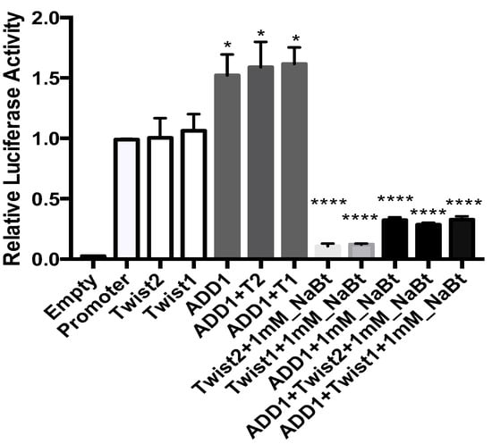 Some mechanisms of repression exerted by TWIST1 and TWIST2 involve the recruitment of histone deacetylases (HDACs) []. To determine the effect of histone deacetylation on the observed expression signal, COS-7 cells were transfected and treated with sodium butyrate (and HDAC inhibitor) 24 h prior to cell lysis to prepare extracts for luciferase activity assays. As shown in Figure 12, when each construct is expressed alone, TWIST1 and TWIST2 exert no significant change in the expression levels of the reporter gene when compared to basal expression, but SREBP1c significantly increased it. Co-expression of TWIST1 or TWIST2 with SREBP1c increased the basal levels of the reporter gene relative to the promoter, but it appears that the activation of the reporter gene is mainly mediated by SREBP1c. To eliminate the possibility that the mechanism of repression involves HDACs as previously reported [], we added sodium butyrate (an HDAC inhibitor). We were expecting to see increased levels of reporter gene expression upon addition of sodium butyrate, but instead we saw a very significant decrease in the expression of the reporter gene, more so in the transfections in which the proteins were expressed alone than when co-expressed together with SREBP1c. These results suggest that recruitment of HDACs is not involved in the transcriptional repression observed with TWIST proteins.
