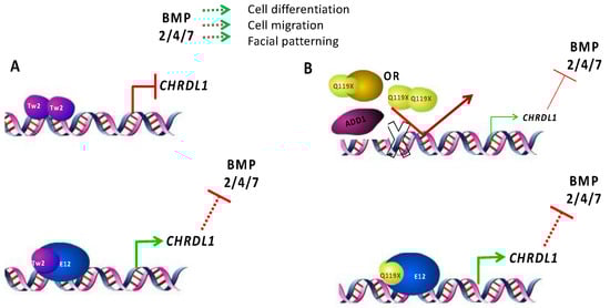 The failure to correctly regulate and fine-tune the expression of CHRDL1 gene expression could explain some of the phenotypic features observed in patients. BMPs and BMP antagonists are secreted proteins that exert their function in a dose-dependent manner []. This concentration equilibrium has been shown to be important in the context of facial development []. Here we propose a model of the action of TWIST2 on the CHRDL1 gene, which leads to modulating BMP signaling (Figure 13). In normal individuals, TWIST2 can effectively act as a molecular switch between activation or repression of BMP signaling through the control of CHRDL1 gene expression. Given that CHRDL1 is a BMP2/4/7 antagonist, we could speculate that during critical times in the formation of facial structures in the Setleis patient embryos, the presence of CHRDL1 would lead to hypo-activation of the BMP signaling pathways and disruption of the BMP spatiotemporal gradient. This idea warrants a careful examination of the available data for the different mouse models concerning facial malformations, and to evaluate expression patterns of the BMPs and BMP antagonists in the tissues that give rise to the face during development. Other members of the TGF-β/BMP super-family should also be considered in order to determine where these molecules fit in our proposed model as other genes involved in BMP signaling were also found to be differentially regulated on Setleis syndrome patients [].