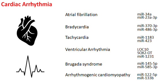 Long QT and short QT syndromes are known as the entities of Brugada syndrome [30]. Risk stratification for sudden cardiac death in patients with Brugada syndrome remains a major challenge. Brugada patients display a distinct miRNA expression profile compared with unaffected control individuals. For example, the miR-145-5p and miR-585-3p are associated with the standing position of Brugada patients, which might be the potential utility of leucocyte-derived miRNAs as prognostic biomarkers for Brugada syndrome [31,32]. Arrhythmogenic cardiomyopathy is a genetically determined disorder caused by mutations in proteins constituting desmosomes, which might be an inherited cardiomyopathy histologically categorized by the replacement of myocardium with inflammation, fibrofatty infiltration, and cardiomyocyte loss [33]. Inflammation might also be involved in the pathogenesis of arrhythmogenic cardiomyopathy with various inflammatory cytokines [34]. Consistently, it has been suggested that circulating levels of cytokine receptors (IL1-R1, IL6-R, and TNF-R1/R2) may be elevated and associated with the risk of arrhythmias in arrhythmogenic cardiomyopathy [35,36,37]. In particular, myocardial expression of IL-17 and/or TNF is substantially enhanced in all cases of arrhythmogenic cardiomyopathy [38]. In a large cohort of samples, the miR-122-5p, miR-133b, miR-133a-3p, miR-142-3p, miR-183-5p, and miR-182-5p could possess high diagnostic potential in arrhythmogenic cardiomyopathy patients [39,40]. The implication of miRNAs in the pathogenesis of arrhythmogenic cardiomyopathy has been the objective of multiple studies.