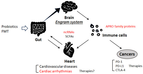 The gut microbiota might play a significant role in human health by modulating the function of the immune system [81]. For example, the immune-regulating potential of gut microbiota could mediate some anti-cancer therapeutic functions, specifically targeting anti-CTLA-4 and anti-PD-L1 treatments that could show better clinical outcomes in patients with some species of Bacteroides and Bifidobacterium, respectively [81,82]. However, there is also much information saying that the gut microbiome has a noteworthy role in reducing the effectiveness of immunotherapy, which could lead to crucial resistance to immune checkpoint therapy [81]. A beneficial response might be observed in the existence of certain gut microbes, whereas microbial imbalance (dysbiosis) due to antibiotic treatment may be associated with poor response to anti-CTLA-4, anti-PD-1, and/or anti-PD-L1 immunotherapies [81]. It might be encouraging to use specific bacteria and their metabolites to restore the beneficial microbiome. Greater benefits of cancer therapies with anti-PD-1, anti-PD-L1, or anti-CTLA-4 monoclonal antibodies could be potentially detected in cancer patients supplemented with some bacterial species, including Enterococcus hirae, Akkermansia mucinifila, and/or Faecalibacterium prausnitzii [82]. This phenomenon has been hypothesized to be related to the action of gut microbiota just on dendritic cells, which are essential to trigger suitable T-cell responses [83]. Additionally, short-chain fatty acids (SCFAs) formed within the gut microbiota might also modulate those anti-CTLA-4 and anti-PD-1 immune responses as well as their anti-tumor efficacy [84]. SCFAs are categorized by having fewer than six carbons, such as acetate, propionate, and butyrate, which are mostly produced in the gut as fermentation products. Therefore, the human gut microbiota or their various metabolites, including SCFAs, have become a possible therapeutic target for the development of cancer interventions as well as for the prevention of cardio-metabolic disorders [85]. Interestingly, there are remarkable associations between gut microbiota and the microglia in the brain, which might suggest the profound crosstalk of gut microbiota and nerve function via the important roles of microglia [86]. Therefore, some modifications in the composition of the gut microbiota might play a critical role in the pathogenesis of several diseases. Remarkably, it has been presumed that cardiovascular diseases, including cardiac arrhythmia, might link to the pathogenesis that is based on the engram memory system [87,88,89] (Figure 3). The engram memory system in the brain could remember the information of a definite inflammation in the body that might be involved in the pathogenesis of various diseases, including ulcerative colitis and/or cardiovascular diseases, in which the immunity-linked processes might be associated with the neuronal responses to memory engrams [90]. Future work should define at the molecular level how this pathway could precisely interfere with regulating cardiac arrhythmias. In particular, upcoming research should focus on the identification of disease-specific engram preservation over time during the latent period of cardiovascular diseases.