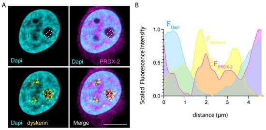 PRDX-2 intranuclear localization. (A) Confocal microscopy analyses of HeLa cells labelled with dyskerin (yellow) and PRDX-2 (magenta) antibodies and counterstained with DAPI (cyan). Note that PRDX-2 is widely diffused in the nucleoplasm and localizes within the nucleoli and the putative CBs. White bars correspond to 10 μm. (B) Graph showing the fluorescence intensity values for DAPI (cyan), dyskerin (yellow), and PRDX-2 (magenta), plotted as a function of distance along a linear ROI (indicated as a dotted rectangular outline in (A)). Dyskerin signal is observed within the nucleolus region, where the DAPI signal is decreased. A clear and evident overlap is observed between the fluorescence profiles of PRDX-2 and dyskerin.