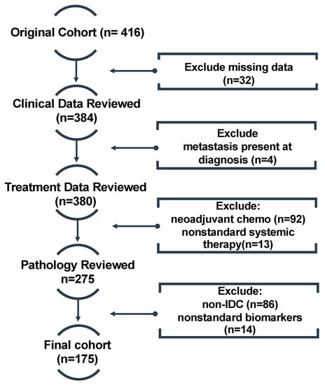 Flow chart displaying patient inclusion/exclusion criteria. Once patients with missing data were removed from the original cohort (n = 416), the remaining patients were excluded in order of clinical, treatment and pathological data. The final cohort for our study consisted of 175 patients. Abbreviations: chemo—chemotherapy; IDC—intraductal carcinoma.