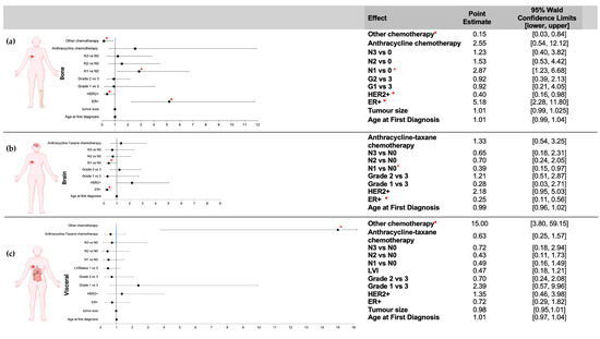 Odds ratios (OR) for bone, brain or visceral metastases according to clinicopathological characteristics. Multivariate analyses were conducted to determine the ORs for developing bone (a) or brain (b) metastasis according to clinicopathological characteristics. ER+ and N1 vs. N0 stage were significantly associated with an increased risk of bone metastasis, whereas HER2+ and “other chemo” were significantly associated with a decreased risk. ER+ was significantly associated with a decreased risk of brain metastasis. (c) ORs for developing visceral metastasis were analyzed using bivariate analysis, and no characteristics were significant. Abbreviations: chemo—chemotherapy; N0—nodal status 0 (0 positive nodes); N1—nodal status 1 (1–3 positive nodes); N2—nodal status 2 (4–9 positive nodes); N3—nodal status 3 (greater than 10 positive nodes); HER2—human epidermal growth factor 2; ER+—estrogen receptor-positive. (* indicates statistically significant, p = 0.05).