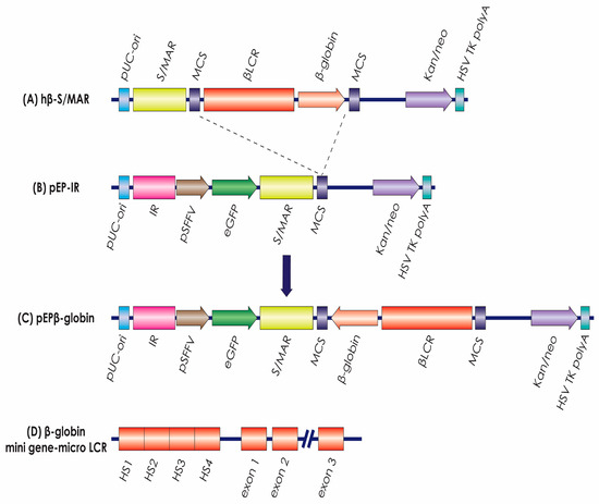 The vectors. Plasmid (A) provided the LCR and β-globin genes that were inserted into plasmid (B), pEP-IR, to form plasmid (C), the experimental vector pEPβ-globin. (D) provides the elements of the LCR and of the β-globin gene transferred, (Details in the Section 2).