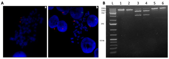 Plasmid rescue assay. Genomic DNA from transfected K562 cells was used to transform One Shot™ Stbl3™ E. coli Chemically Competent cells (ThermoFisher Scientific, St. Bend, OR, USA), according to the manufacturer’s instructions. Transformed E. coli colonies were selected using LB-agar plates containing 30 μg/mL kanamycin (Invitrogen). Plasmid DNA was extracted (QuickLyse© miniprep kit, Qiagen) from randomly selected single resistant colonies and subjected to restriction enzyme analysis with SalI, PciI, and NsiI enzymes. Restriction digests were analyzed by agarose gel electrophoresis at 0.8 g% [27,29].