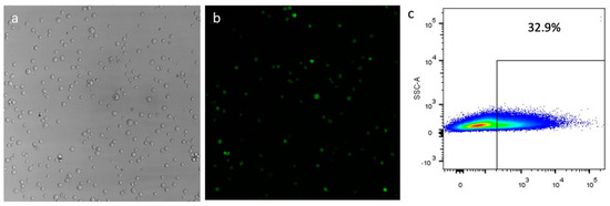 Transfections of CD34+ cells with the plasmid pEPβ-globin 48 h post-transfection; (a) shows phase contrast microscopy; (b) shows UV microscopy of the same field. (c) shows the flow cytometry for the estimation of the transfection efficiency (more data in Supplementary Table S1 and Figure 1).