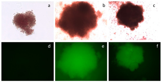 Colonies from the CFC assay of CD34+/eGFP+ cells. Top row, (a–c): phase contrast microscopy. Bottom row, (d–f): UV microscopy. Frames (a,d): non-transfected CD34+ cells. Frames (b,e): CD34+/eGFP+ cells transfected with plasmid pEP-IR. Frames (c,f): CD34+/eGFP+ cells transfected with plasmid pEPβ-globin.
