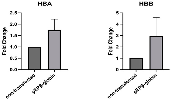 Three separate nucleofections were carried out from three cultures of non-transfected cells (a), CD34+ cells transfected with the vector pEP-IR (b), used as a control regarding the identity and number of colonies produced, and CD34+ cells transfected with the experimental vector pEPβ-globin (c). For each of these transfections, a CFC assay was performed, and differentiated cells were produced. Duplicate samples of pooled fluorescent colonies were taken from each CFC assay. These colonies were derived from CD34+/eGFP+ and non-transfected CD34+ cells. The samples were then used for reverse transcription, followed by qPCR (a total of six PCRs per a, b, and c sets of nucleofections). Important results were obtained, as the estimation of the β-globin mRNA was a 2949-fold increase, and that of the α-globin mRNA was a 1738-fold increase compared to that of the non-transfected CD34+ cells (Figure 7). Both β-globin and α-globin mRNA were elevated in the BFU-E/CFUE/CFU-GM/eGFP+ cell colonies of transfected CD34+. However, only the β-globin mRNA fold change reached statistical significance (Figure 7; Table 2). Non-fluorescent colonies deriving from the same plates of seeded CFC assays CD34+/eGFP+ cells were found to be negative for the vector pEPβ-globin, (Supplement Figure S2).