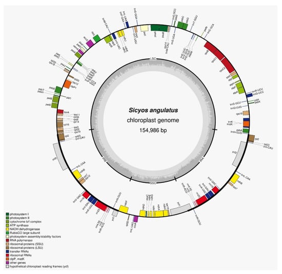 The chloroplast genome of Sicyos angulatus (SA) was assembled and annotated in this study, and these efforts shed light on the genetic makeup of this species and its relationship with other species in the Cucurbitaceae family []. We have obtained deeper knowledge of their genomic characteristics and evolutionary dynamics by contrasting the chloroplast genomes of SA with those of other species in the family. Moreover, this study offers a thorough grasp of the genomic size, gene content, and structural organization of the chloroplast genomes of the Sicyos and other genera belonging to the same family.