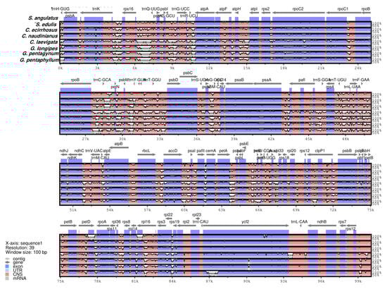The many complete CP genome permitted us to evaluate the sequence variation among species. The divergence of the sequence in the CP genome among the eight species was plotted with a cut-off of 70% identity by using mVISTA. The genome of S. angulatus was set as the reference genome.