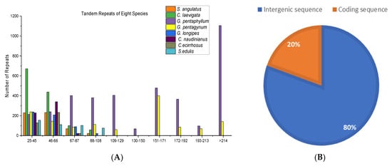 Length and distribution of tandem repeats using tandem repeat finder among eight species from Cucurbitaceae family. The number of repeats is shown on the y-axis (A). Location distribution of overall tandem repeats in percentage (B).