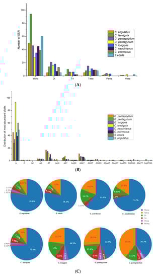 SSR analysis revealed that among eight species, mononucleotide repeats were the most abundant, followed by the di-, tri-, tetra, penta-, and hexanucleotide repeats (Figure 4A). The highest percentage count of mononucleotide repeats was observed in C. laevigata (72.8%), followed by S. edulis (80.0%), and lowest percent count of mononucleotide repeats was in G. pentagynum (46.6%). In mononucleotide repeats, A was found to be abundant in C. laevigata (93 counts), followed by S. edulis (60 counts) and S. angulatus (49 counts) (Figure 4B). In di-nucleotide repeats, AT in tri-nucleotide AAT, in tetra-nucleotide AAAT, in penta-nucleotide AGGGG, and in hexanucleotide AAATGG is most abundant among eight species of the Cucurbitaceae family. Moreover, the SSRs length distribution for mono-nucleotide repeats is highest in S. edulis (78.2%), followed by S. angulatus (76.8%), C. laevigata (73.4%), C. naudinianus (71.2%), C. ecirrhosus (61.4%), G. longipes (46.5), G. pentagynum (42.9%), and G. pentaphyllum (39.7%) (Figure 4C).