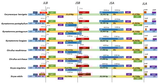 The CP genome size of G. pentaphyllum is the largest among the eight studied genomes (159,208 bp), and it is 4222 bp longer than the plastomes of S. angulatus (Table 1).
