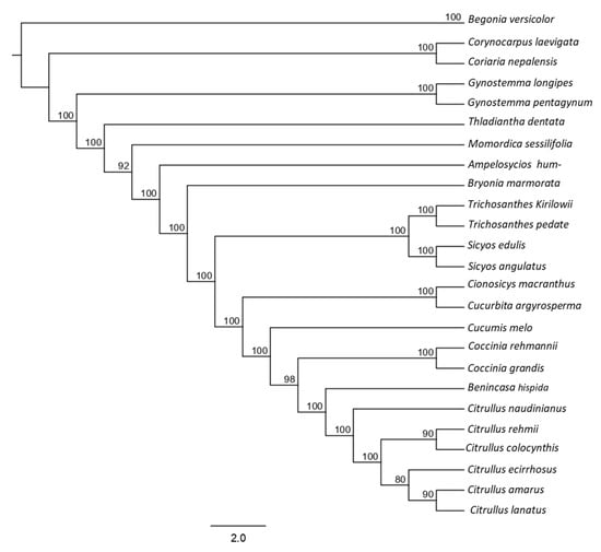 To determine the phylogenetic relationship between S. angulatus and other species of Cucurbitaceae family, the Tamura–Nei method was used based on the plastome of all the species by using the CDs sequence from the complete cp genome sequence. All 25 species developed two branches with dedicated support using bootstrap values of 100% (Figure 6). The phylogenetic tree indicates that Sicyos angulatus is clustered with Sicyos edulis. In addition, Sicyos genus is close to the Trichosanthes genus. Also, the Sicyos genus is closely related to Citrullus ecirrhosus and Citrullus naudinianus (Citrullus genus). However, it can be seen that the Sicyos genus is more closer to Gynostemma longipes, Gynostemma pentagynym, Gynostemma pentaphyllum (Gynostemm genus), as well as Corvynocarpus laevigata from the Cucurbitaceae family.