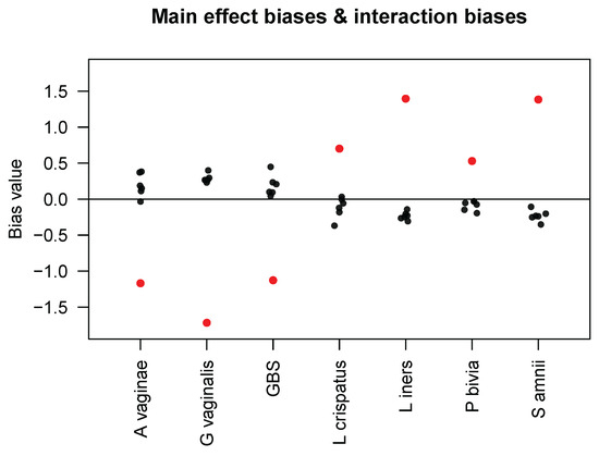Main effect biases (red dots) of the seven taxa in the Brooks mock community samples and interaction biases (black dots) that each taxon (in the x-axis) caused to the other six taxa, as estimated by Zhao and Satten [6].