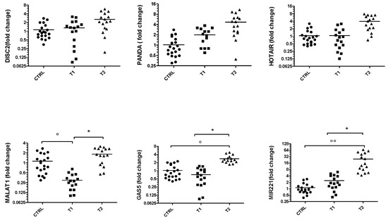 Gene expression of DISC2, PANDA, HOTAIR, MALAT1, GAS5 and miR-221 in PD group. Values are expressed as the fold change with respect to the control group. ° p < 0.001 versus CTRL; * p < 0.05 versus T1.