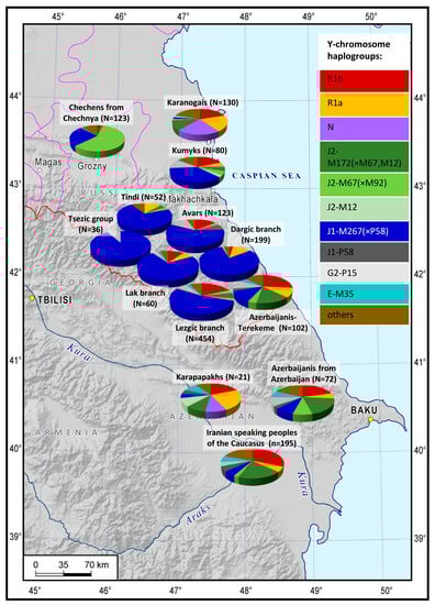 Y-haplogroup spectrum in East Caucasus populations. The colored sections in the pie charts represent requencies of different haplogroups: red—R1b, golden—R1a, purple—N, dark green—J2-M172(×M67,M12), light green—J2-M67(×M92), tea green—J2-M12, blue—J1-M267(×P58), dark grey—J1-P58, light grey—G2-P15, turquoise—E-M35, brown—other.