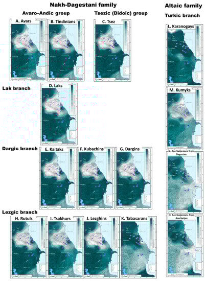 - Karafet, T.M.; Bulayeva, K.B.; Nichols, J.; A Bulayev, O.; Gurgenova, F.; Omarova, J.; Yepiskoposyan, L.; Savina, O.V.; Rodrigue, B.H.; Hammer, M.F. Coevolution of genes and languages and high levels of population structure among the highland populations of Daghestan. J. Hum. Genet. 2016, 61, 181–191. [Google Scholar] [CrossRef]