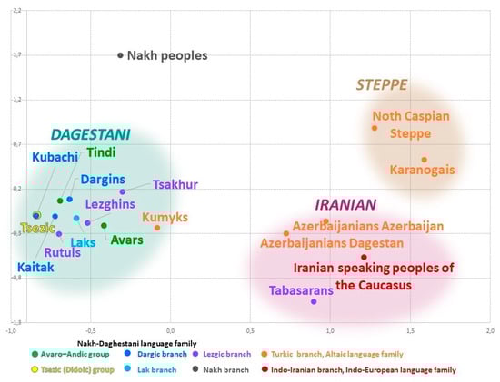 While studying the genotyping data of 18 indigenous populations of the East Caucasus and the adjacent regions (N = 2216), we factored their language and area into the analysis. The geographic variability of the analyzed Y-chromosome haplogroups across the East Caucasus (Figure 1, Supplementary Table S3) is not the same for the representatives of different language families: it is more pronounced for Nakh-Dagestanian linguistic groups than for Turkic and Iranian-speaking populations.