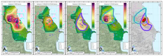 The distribution of Y-haplogroup J1-Y3495 and its main branches in the Eastern Caucasus: (A) J1-Y3495; (B) J1-Y3495(×ZS3114,CTS1460); (C) J1-ZS3114; (D) J1-CTS1460; (E) area of J1-Y3495 haplogroup origin.
