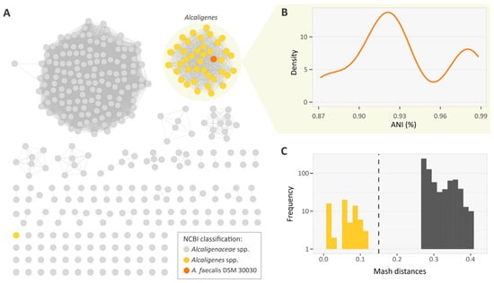 To accurately compare Alcaligenes with minimal genome misclassification, we retrieved 2492 Alcaligenaceae genomes from GenBank (April 2023). We then filtered out low-quality, fragmented, and redundant genomes (see methods). Using Mash v.2.2.2 [18], we computed pairwise distances between genomes to generate a Mash distance network with a minimum threshold of 0.20 (~80% ANI). Networks inferred with genomic distance or identity are highly structured and feature communities associated with taxonomic groups [19]. We used the type strain A. faecalis DSM 30030 (GCF_002443155.1) as an anchor isolate to evaluate Mash distances in the Alcaligenaceae family network (Figure 1A). This identified a community of 64 genomes corresponding to the Alcaligenes genus according to the NCBI classification. The ANI analysis showed densities above 87% (Figure 1B), and the sorted distribution of Mash values for A. faecalis DSM 30030 showed an abrupt break around 0.13 (Figure 1C), suggesting that 0.15 (~85% ANI) is an effective threshold for delineating the Alcaligenes genus. The type strain A. endophyticus DSM 100498 (GCA_026344035) was removed as a misclassified Alcaligenes genome. The final dataset of 64 high-quality Alcaligenes genomes was used in the downstream analyses described below.