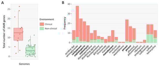 Distribution of antimicrobial resistance (AMR) genes in clinical and non-clinical isolates. (A) Total AMR genes identified in Alcaligenes. (B) Frequency of different classes of AMR genes in mobile genetic elements of clinical and non-clinical genomes. β-lactams are marked in bold.