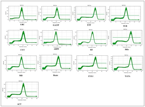The cDNA, reverse transcribed from the total RNA of reed canary grass leaves after exposure to drought, salt, Cd, and waterlogging stresses, was used as the reaction sample for the RT-qPCR reaction. The results showed a clear single peak in the solution curve for all reference genes, indicating that the primers selected had excellent specificity and amplified the target product of each gene generated (Figure 1). Additionally, the RT-qPCR results were reproducible, and no primer dimers were produced. These findings demonstrate that the RT-qPCR results are authentic and reliable, making them suitable for use in subsequent studies.