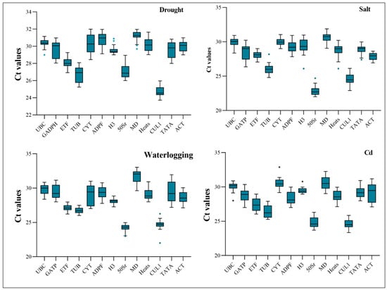 Ct values for reference genes are inversely related to target gene expression levels. Therefore, higher Ct values indicate a lower gene expression level in the sample. Ct values for different candidate reference genes were represented by box plots. The upper and lower box plot limits indicate the maximum and minimum Ct values, and the dispersion indicates gene stability. It is more likely that a sample with a lower dispersion has more stable gene expression. A variety of abiotic stresses led to Ct values ranging from 22.92 to 32.95 for the candidate reference genes. The UBC gene showed the highest expression abundance under drought stress, the CYT gene under salt stress, the ETF gene under waterlogging stress and the H3 gene under cadmium stress (Figure 2).