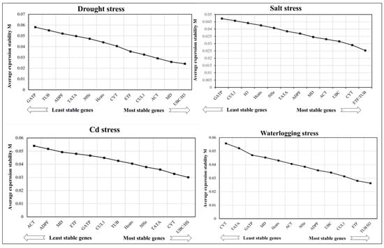 GeNorm software was used to calculate the M value, which represents the stability of the expression of the candidate reference gene. Generally, the lower the M value, the more stable the candidate gene is. The M value was used to rank the stability of the candidate reference genes. This research found that UBC and H3 were the most stably expressed candidate reference genes in drought and Cd stresses, with M values of 0.03 and 0.024, respectively (Figure 3). ETF and TUB ranked highest in stability in salt stress, with M values of 0.025. In waterlogging stress, TUB and H3 genes were the most stably expressed genes, with M values of 0.026. However, CYT was the least stable gene, with an M value of 0.057 (Figure 3).