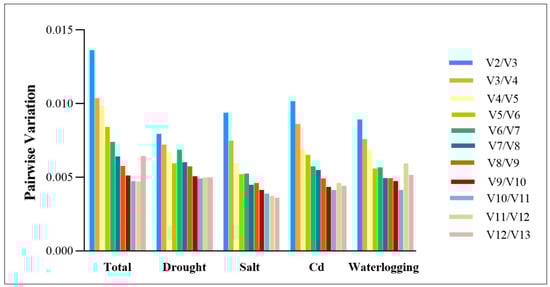 A pairwise variation analysis can be useful for determining the optimal number of reference genes for accurate normalization. The pairwise variation values of standard factors are typically used, with a default threshold of 0.15 for V. When the Vn/Vn + 1 value is less than 0.15, n is considered the optimal number of reference genes, while n+1 reference genes are required when the value is greater. As Vn/Vn + 1 values fell below 0.15 under various abiotic stress, it was concluded that only two reference genes were required to normalize gene expression data (Figure 4).