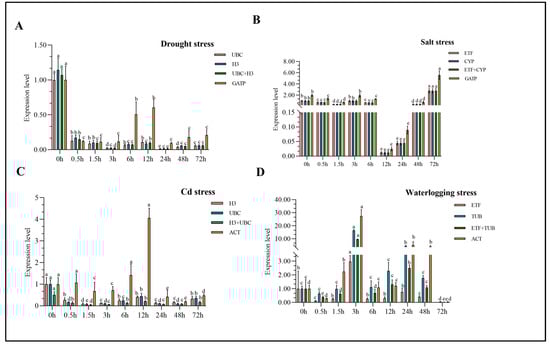 The stability of the candidate reference gene should be validated by selecting and normalizing the expression of the suitable target gene. In this study, target genes were chosen for each stress, and the two most and one least stable reference genes were selected for expression pattern analysis using the 2−∆∆Ct method (Table 3). The most stable genes (UBC and H3) were suitable for normalizing PIP-1 expression under drought stress, while the least stable gene (GATP) showed a different pattern (Figure 5A). Under salt stress, the selected most stable genes (ETF + CYP) normalized the expression of PAL genes compared to the least stable gene (GATP), and the normalization results showed different trends (Figure 5B). Similarly, under Cd stress, normalizing NAC 90 using the unstable reference gene ACT resulted in a different trend than the most stable genes (H3 and UBC) (Figure 5C). Under waterlogging stress, the most stable genes (ETF and TUB) exhibited similar trends, but the least stable reference gene (TUB) resulted in a different trend (Figure 5D). These results showed that the selected stable reference genes were reliable for this study, as they showed consistent expression patterns when used to normalize the expression of target genes under different abiotic stresses.