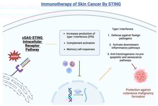 Although checkpoint inhibitor therapies currently exist to target skin cancer, their primary mechanisms do not primarily rely on inducing damage to dsDNA in tumor cells. Therapies for malignant skin cancer, such as radiotherapy and chemotherapy, rely on the STING pathway for regulating type 1 IFN production. Other documented mechanisms such as inducing DNA damage and forming micronuclei, inducing apoptosis, and exposing the damaged DNA to PPRs on the cell surface have been described []. Tumor cells have been found to suppress STING’s activity, resulting in resistance to these treatments [,].