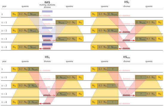 Thus, when matings were performed on IIS, each year queens were selected as drone producers and assigned randomly to the IIS so that each IIS comprised eight queens. Here, the selection criterion was defined as the sum of maternal and direct estimated breeding values of the queen, because the genetic quality of (haploid) drone offspring is determined by the queen alone [18]. Each virgin queen was inseminated with 12 drones that all came from the same randomly chosen queen on the IIS. However, to counteract high inbreeding rates, it was prevented to inseminate queens with drones from their own dam or an aunt. The three different types of IIS (IIS2, IIS3, and IISmix) only differed in the group of queens from which the drone producers were selected. These were all two-year-old queens, all three-year-old queens, and all two-or-three-year-old-queens, respectively (Figure 2).