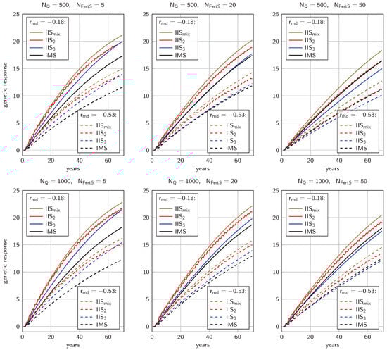 The genetic gain after 70 years ranged from 10.13 units (, , 50 IIS3) to 22.85 units (, , 5 IISmix). Ceteris paribus, the genetic gain in the larger population () was between 5.6% and 19.9% higher than in the smaller population (); likewise, the trait with had a 40.0% to 50.0% higher revenue than the trait with (Figure 3).