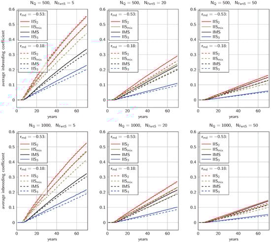 As in the case of genetic gain, the general influences of population size and the correlation on inbreeding development (higher inbreeding with smaller and stronger negative ) are standard observations that could previously be seen in several other simulation studies [24,43,47].