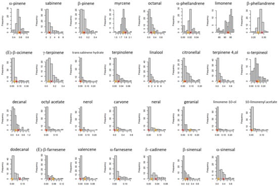 - Ferrer, V.; Paymal, N.; Costantino, G.; Paoli, M.; Quinton, C.; Tomi, F.; Luro, F. Correspondence between the compositional and aromatic diversity of leaf and fruit essential oils and pomological diversity of 43 sweet oranges (Citrus x aurantium var sinensis L.). Plants 2023, 12, 990. [Google Scholar] [CrossRef] [PubMed]
