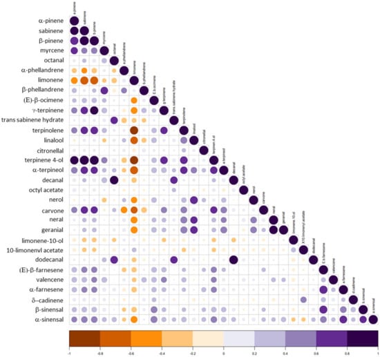 - Ferrer, V.; Paymal, N.; Quinton, C.; Tomi, F.; Luro, F. Investigations of the Chemical Composition and Aromatic Properties of Peel Essential Oils throughout the Complete Phase of Fruit Development for Two Cultivars of Sweet Orange (Citrus sinensis (L.) Osb.). Plants 2022, 11, 2747. [Google Scholar] [CrossRef] [PubMed]