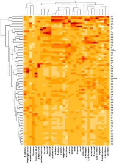 - Tomi, F.; Barzalona, M.; Casanova, J.; Luro, F. Chemical Variability of the Leaf Oil of 113 Hybrids from Citrus clementina (Commun) × Citrus deliciosa (Willow Leaf). Flavour Fragr. J. 2008, 23, 152–163. [Google Scholar] [CrossRef]
